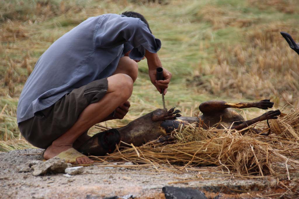 Was in dieser Umgebung, wo überall Hühner frei herumlaufen, wo man überall sieht, wie Nahrung zubereitet wird – da war der Anblick eines Mannes, der einem gegrillten Hund mit einem großen Messer die letzten Borsten entfernte, vollkommen in die Situation passend und bei weitem nicht so schockierend, wie ich mir eine solche Situation vorher ausgemalt hätte. Ich möchte ganz sicher nicht Hund (und Schlange und Käfer und die meisten Meeresviecherereien etc.) probieren, aber in genau dieser Situation hatte das ganze nichts, was ich verabscheungswürdig gefunden hätte, definitiv nicht so übel wie Massentierhaltung und Kükenschredderei (Sensiblere Naturen verzichten besser darauf, auf diesen Link zu klicken: Gegrillter Hund).